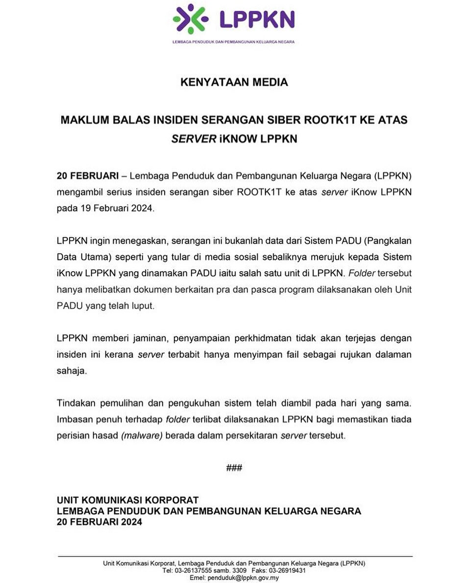 Tarikh Kemaskini 23 January 2026 #TarikhTajuk 116-11-2024KPWKM HARAP LEBIH BANYAK SEKTOR SWASTA, NGO DAN KOMUNITI MELAKSANAKAN PROGRAM KESEJAHTERAAN KELUARGA 209-11-2024HARI KELUARGA DIJADIKAN ACARA TETAP TAHUNAN DI SEMUA KEMENTERIAN DAN AGENSI 326-09-2024LPPKN BERSAMA UNFPA PERGIAT ADVOKASI ‘MERANCANG KELUARGA SEJAHTERA’ 411-07-2024KAJIAN PENDUDUK DAN KELUARGA MALAYSIA (KPKM-6) 2024 : SUARA KELUARGA, MASA DEPAN NEGARA 527-06-2024600,000 ORANG REMAJA MENDAPAT PENDIDIKAN KESIHATAN REPRODUKTIF (SRH) MENERUSI PROGRAM KASIH REMAJA 615-05-2024HARI KELUARGA ANTARABANGSA: PBB IKTIRAF AMALAN BAIK MALAYSIA 712-05-2024"TERIMA KASIH IBU" SIMBOLIK USAHA IBU TERHADAP ANAK 801-03-2024MEGATREND GLOBAL TURUT PENGARUHI KELUARGA DI MALAYSIA 920-02-2024MAKLUM BALAS INSIDEN SERANGAN SIBER R00TK1T KE ATAS SERVER iKNOW LPPKN 1020-01-2024KPWKM SASAR 57,000 ORANG WANITA AKAN MENDAPAT MANFAAT MELALUI WCARE 1121-11-2023KPWKM MULA GERAK KERJA PENUBUHAN PUSAT SUBFERTILITI PERTAMA NEGARA 1209-11-2023KELUARGA HARMONI NEGARA MADANI, KPWKM TEKAD BANGUN MASYARAKAT MELALUI PENGUKUHAN INSTITUSI KELUARGA 1330-09-2023LPPKN DAN JABATAN KESIHATAN NEGERI SARAWAK RINTIS KERJASAMA SARINGAN KANSER SERVIKS 1430-09-20231,000 WANITA SARAWAK JALANI SARINGAN UJIAN HPV DNA DALAM MASA SEHARI 1526-09-202389.3 PERATUS WANITA MALAYSIA BUAT KEPUTUSAN SENDIRI PILIH PENGGUNAAN KONTRASEPTIF 1603-09-2023KPWKM TERUS PERGIAT KEMPEN KESEDARAN REPRODUKTIF WANITA 1715-08-2023FORUM MENGORAK KUASA KESAKSAMAAN GENDER: MEMPERKASA SUARA WANITA DAN KANAK-KANAK PEREMPUAN BAGI MEMBUKA PELUANG DUNIA TANPA BATAS 1811-07-2023TEMA HARI PENDUDUK SEDUNIA 2023 MENANGANI ISU KEPENDUDUKAN SECARA INKLUSIF DENGAN MEMPERKASA PERANAN WANITA DAN MENGARUS PERDANA GENDER 1914-06-2023SIARAN MEDIA TERIMA KASIH AYAH, MENJULANG BAPA SEBAGAI FIGURA KELUARGA 2029-05-2023KLINIK SUBFERTILITI LPPKN PULAU PINANG BERI HARAPAN KEPADA PASANGAN DAPATKAN ZURIAT « 1 2 3 »